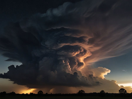 Majestic clouds illuminated by dramatic lighting in the sky, creating a breathtaking scene of nature against a dark background, evoking tranquility and awe
