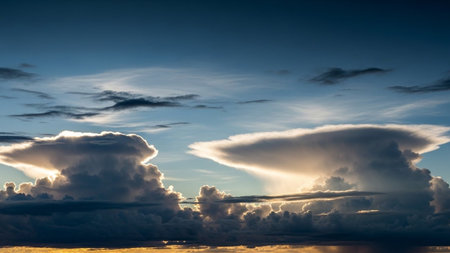 cumulonimbus and lenticular clouds are illuminated by the warm golden light of a sunset against a clear blue sky.
