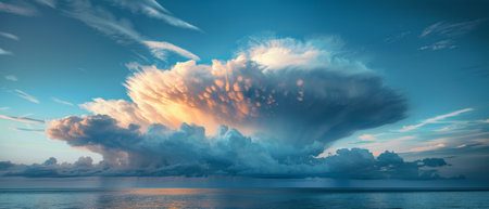 A dramatic cumulonimbus cloud formation glows with golden sunset light above a tranquil ocean horizon.