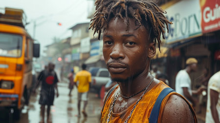 A compelling street portrait of a young man adorned in traditional face paint and vibrant attire, standing in a bustling African market street.