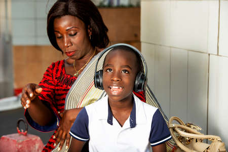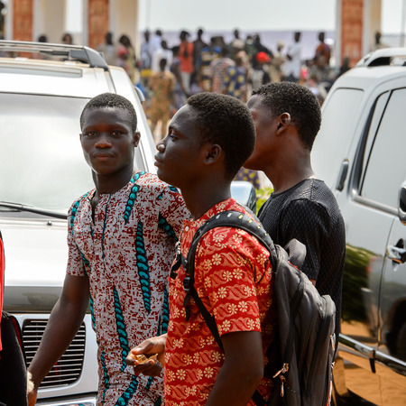 OUIDAH, BENIN - Jan 10, 2017: Unidentified Beninese boys in colored clothes walk at the voodoo festival, which is anually celebrated on January, 10th.