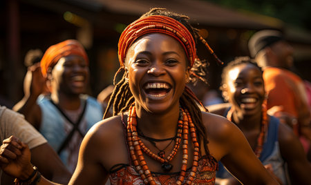 A cheerful group of people in culturally vibrant attire against a colorful backdrop. The scene conveys unity, friendship, and cultural identity, with bright yellow patterns symbolizing community and joy.