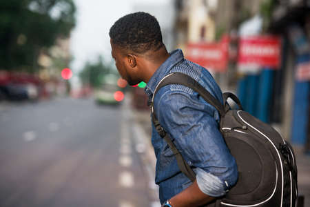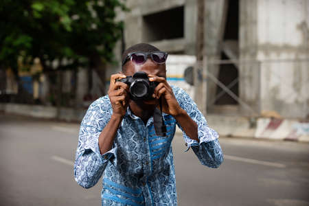 Handsome african man in yellow sunglasses and orange jacket standing on the street of Nairobi.