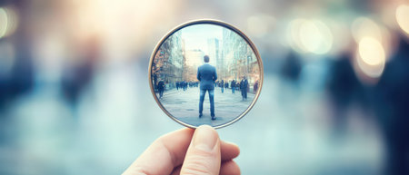 A close-up view through a magnifying glass reveals a diverse group of individuals gathered outdoors, emphasizing detail and human connection.