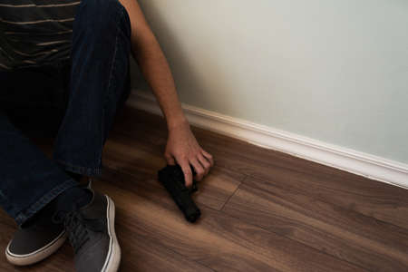 Close up of an unhappy adult man with a depression problem sitting in a corner with a gun and thinking about suicide
