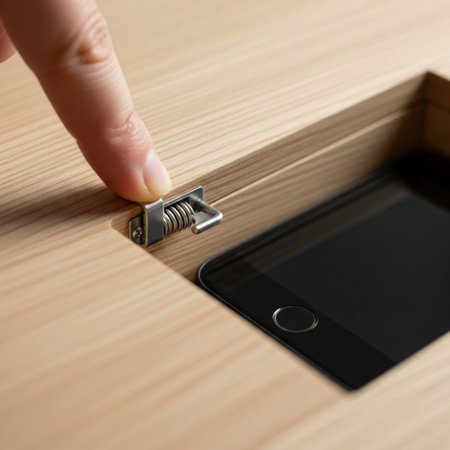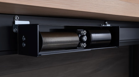 This image showcases a sleek roll-out storage organizer integrated into a modern desk, perfect for optimizing workspace efficiency and aesthetic appeal.