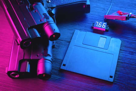 Cyberpunk concept background. Floppy disk, guns on the black table background in neon lights.