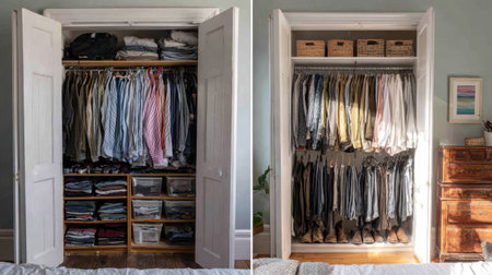 This image showcases a well-organized closet featuring a blend of hanging clothes and neatly folded garments on shelves, perfect for modern living.