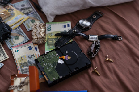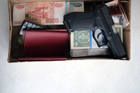 Money and weapons in crime lab for investigation, conceptual image