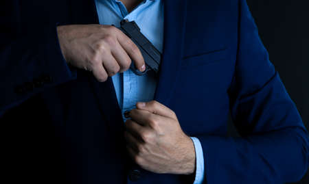 man in a suit hides a gun in his pocket