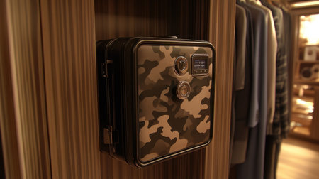 A sleek camouflage safe mounted in a modern closet, designed to provide stylish and secure storage for personal items while enhancing home organization.