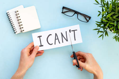 I can do it concept. Words I cannot become I can with scissors