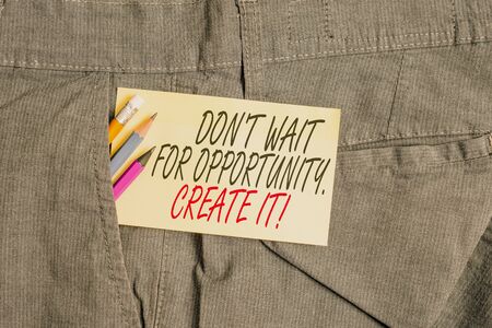 Writing note showing Don T Wait For Opportunity Create It. Business concept for work hard on yourself and begin from this moment Writing equipment and yellow note paper inside pocket of man trousers