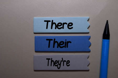 There, Their, They're write on a sticky note isolated on office desk. Learning use proper grammar