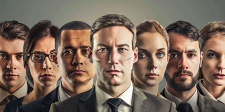 Multiracial adults headshots ai generated portraits images collage. African American, European collection faces photographs studio shots. Diverse people pictures photorealistic. Photos realistic