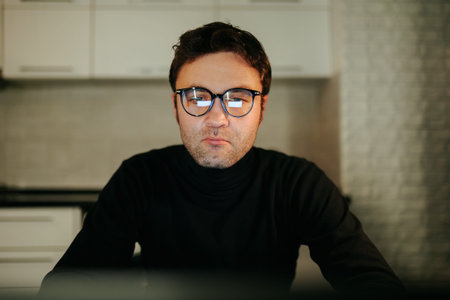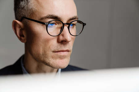 Portrait stressful businessman wearing glasses in dark light, manager looking on pc on creative planner project web at night, analyzing strategy marketing business report at modern office. Pecuniary.