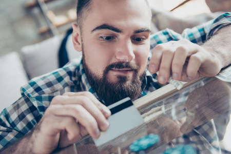 Close up photo of excited cheerful happy drug addict with beard clothed in checkered shirt, he is preparing a sorting line and holding a rolled banknote and credit card