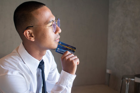 Young hipster man doing shopping online and using his credit card. Vertical.