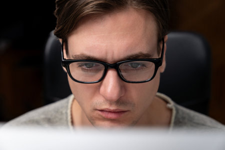 Programmer in home office concentrating on finding bugs while doing coding on computer, extreme close up shot. IT admin frowning while looking at screen, confused by errors in lines of code, camera A