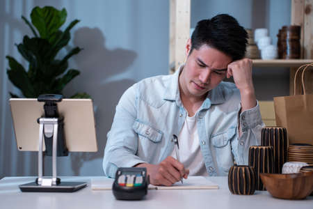 Depressed Asian male feel worried about financial problem in business. Stressed desperate handsome man look frustrated to sale order in book and think of money debt, budget loss, bankruptcy at store.