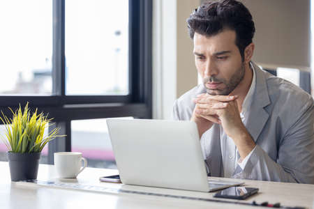Closeup focused businessman working on laptop computer at home office. Serious male entrepreneur looking at laptop screen at remote workplace. Portrait of young business man using laptop for job