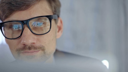 Man with glasses is working intently in office. Portrait of director in leather armchair. Young man is working on the delivery of the project