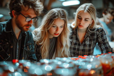 Group of creative multietnic friends sitting at wooden table. People having fun while playing board game.