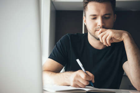 Thoughtfull caucasian man concentrated on work is writing something while working from home