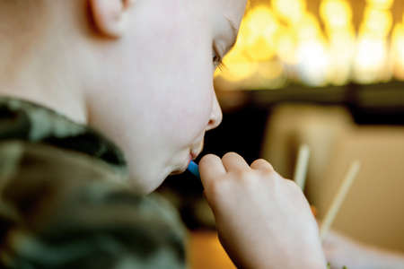 A boy in a trendy yellow knitted hat sitting by the table at home and doing homework.