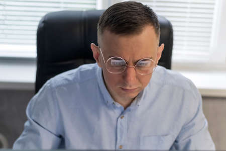Man with glasses is working intently in office. Portrait of director in leather armchair. Young man is working on the delivery of the project