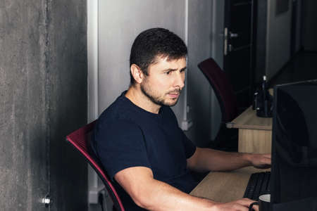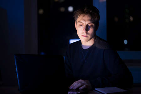 Close-up portrait of serious concentrated developer working at night