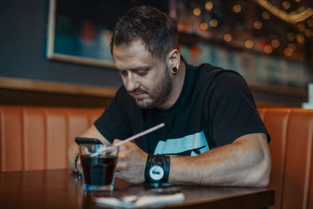 Young attractive man looking at mobile phone screen and drinking soda.
