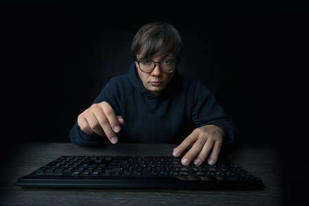 man programmer holds his hands on the keyboard and looks at the camera, over dark background