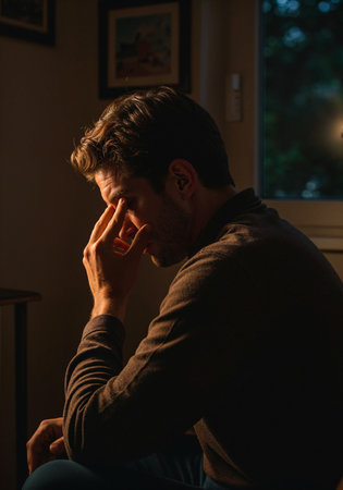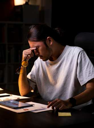 Young man struggles with a headache while working from his home office, battling exhaustion and anxiety. The image reflects mental health challenges in todays fast paced world