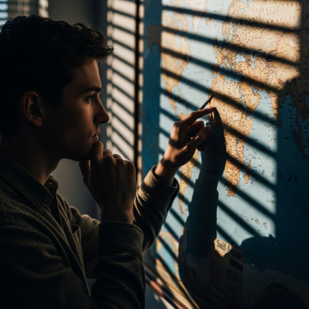 Side profile silhouette of a thoughtful person tracing travel routes on a world map in dramatic rim