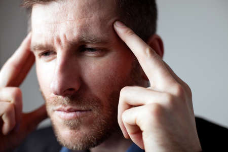 Young man frustrated and suffering headache, close up