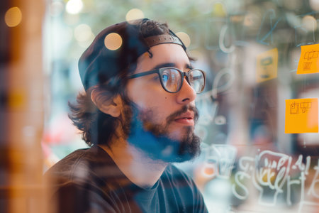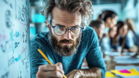 Focused man with glasses sketches ideas on a whiteboard in a collaborative workspace during a brainstorming session