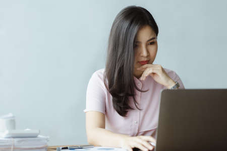 Beautiful Asian woman working with computers in the office of a startup company, she is a company finance employee working in the finance department. Concept of women working in a company.