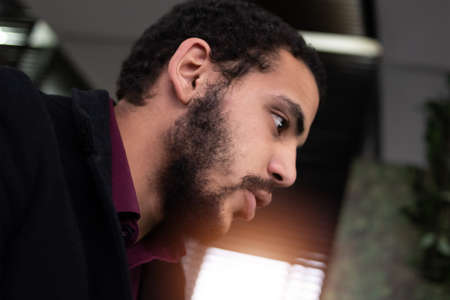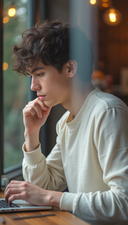 Thoughtful young man working on a laptop by the window