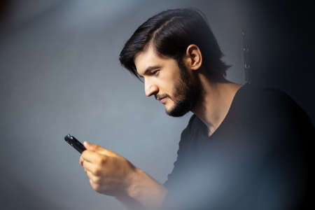Portrait of young man, looking in smartphone. On the background of grey wall.