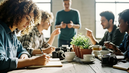 A Creative brainstorming session with content creator analyzing ideas on whiteboard
