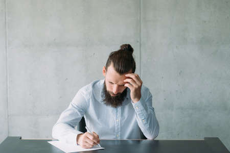 Corporate life. Confused employee resignation notice. Gray wall background. Copy space.