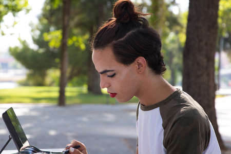 Boy is drawing with a pencil sitting at a table in a street cafe.