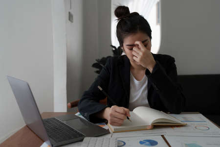 Asian business woman worry about marketing plan of this years. Account, Real Estate Agent, Finance concpet