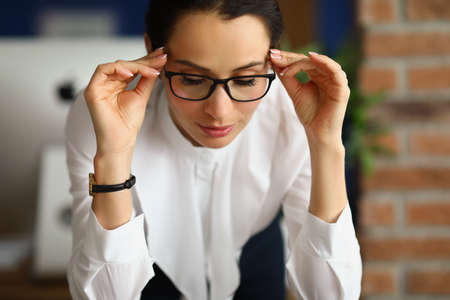 Side view of serious businesswoman concentrate working laptop in office.