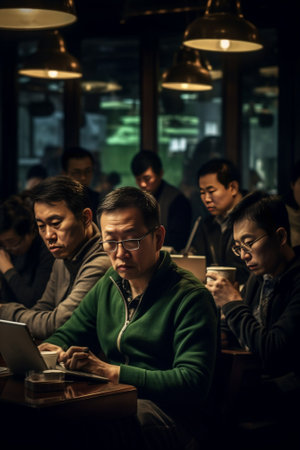 Generative AI : Group of asian sitting use smartphone and laptop at coffee shop Social network and technology concept connection internet chatting