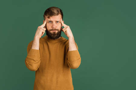 Caucasian mans portrait isolated over green studio background with copyspace
