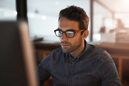 Keeping a strong focus to finish the task. a young businessman working late on a computer in an office.