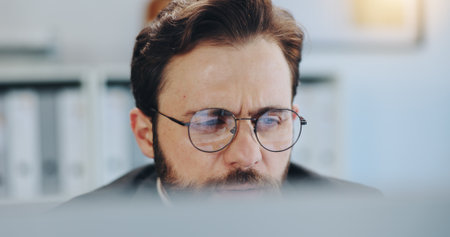 Reading, online and glasses with business man in office for research, client assessment and portfolio report. Project timeline, account review and planning with person in agency for admin update