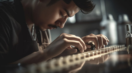Barista Male Asian Young Adult Preparing espresso shots for drinks in coffee shop. Generative AI AIG22.